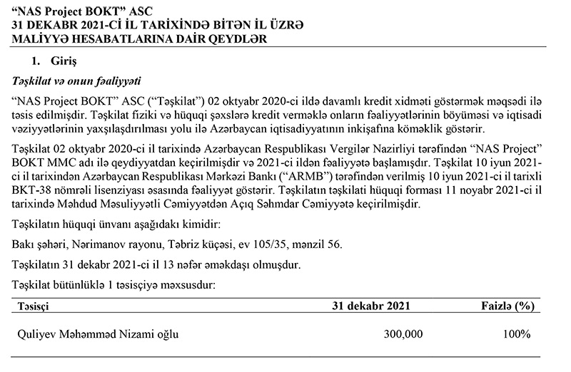 Qeyd edək ki, “NAS Project BOKT” ASC 02 oktyabr 2020-ci ildə davamlı kredit xidməti göstərmək məqsədilə təsis edilib. "Nas Project BOKT" ASC Azərbaycan Respublikası Mərkəzi Bankının 10 iyun 2021-ci il tarixli, BKT -38 saylı Lisenziyası əsasında fəaliyyət göstərir. ASC-nin nizamnamə kapitalı 300 min manat təşkil edir.