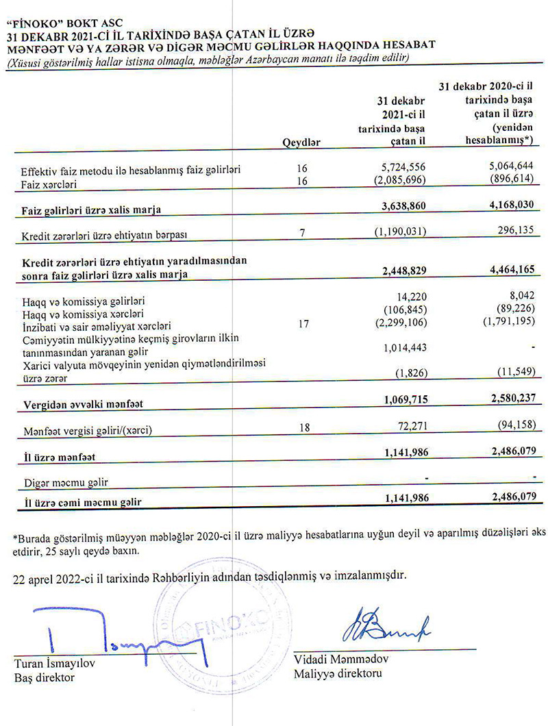 "Finoko" BOKT ASC 2021-ci ili 1 milyon 142 min manat xalis mənfəət ilə başa vurub. Halbuki, Təşkilat 2020-ci ili 2 milyon 486 min manat xalis mənfəət ilə bağlamışdı. Beləliklə, 2020-ci illə müqayisədə 2021-ci ildə "Finoko"nun xalis mənfəəti 2,2 dəfə azalıb.
