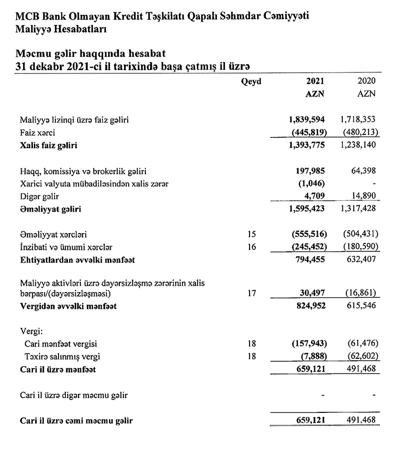 Marja.az təşkilatın audit olunmuş hesabatlarına istinadən xəbər verir ki, “MCB BOKT”un 2020-ci ildə maliyyə lizinqi üzrə faiz gəlirləri 1 milyon 718 min 353 manat ikən, 2021-ci ildə 1 milyon 839 min 594 manat təşkil edib (7% artıb).