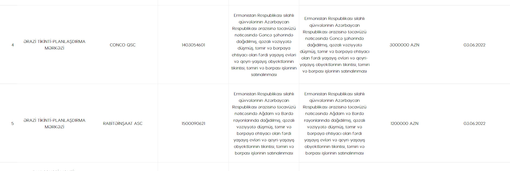 Dövlət satınalmalarının vahid internet portalında verilən məlumata görə, tenderlərin qalibləri “Conco” QSC və “Rabitəinşaat” ASC-dir.