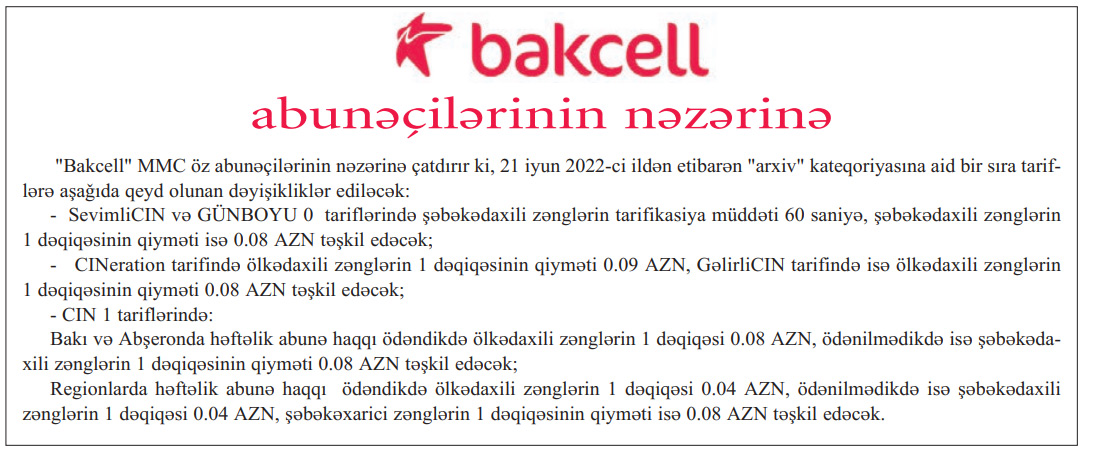"Bakcell" MMC öz abunəçiləri üçün 21 iyun 2022-ci ildən etibarən "arxiv" kateqoriyasına aid bir sıra tariflərə üzrə qiymətləri artırır.