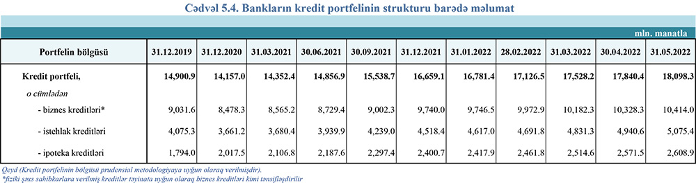 2022-ci ilin ilk 5 ayında (yanvar-may) bankların cəmi kredit portfeli 1 milyard 439.2 milyon maant, o cümlədən biznes kreditləri 674 milyon manat, istehlak kreditləri 557 milyon manat, ipoteka kreditləri isə 208.2 milyon manat artıb.