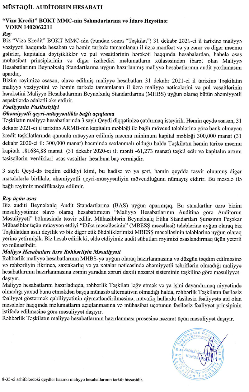 "Viza Kredit Bank Olmayan Kredit Təşkilatı" 2021-ci ili 203 min 305 manat xalis mənfəət ilə başa vurub.