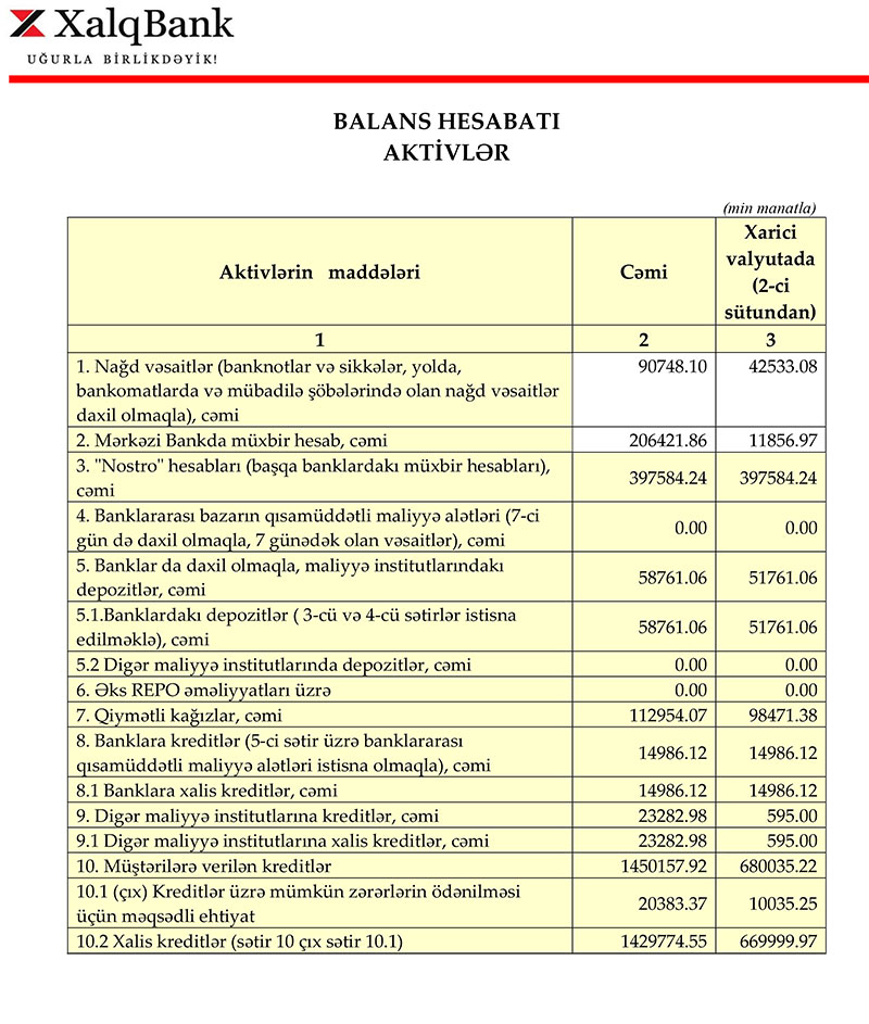 Azərbaycanın ən böyük banklarından biri olan "Xalq Bank" 2022-ci ilin birinci yarısını (yanvar-iyun dövrünü) 11 milyon 828 min manat xalis mənfəət ilə başa vurub. Bank ötən ilin eyni dövrünü 5 milyon 819 min manat xalis mənfəət ilə bağlamışdı. Beləliklə, 2021-ci ilin 1-ci yarısı ilə müqayisədə 2022-ci ilin 1-ci yarısında "Xalq Bank"ın xalis mənfəəti 2 dəfə artıb. Xalis mənfəətin artması gəlirlərin artması və aktivlər üzrə mümkün zərərlərin ödənilməsi üçün xüsusi ehtiyatın yaradılmasına ayırmanın azalması ilə əlaqədardır.