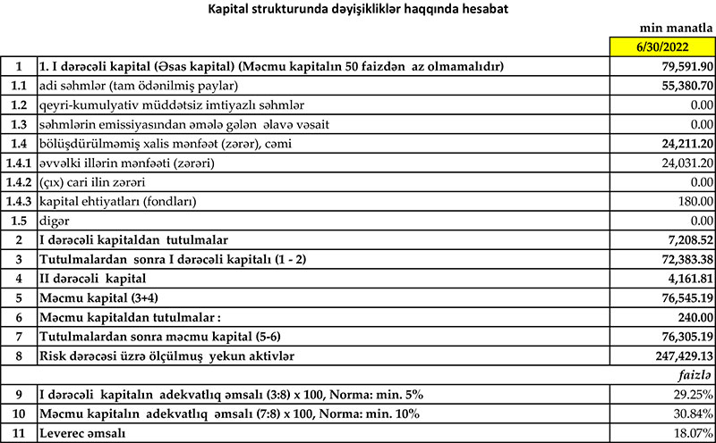 2022-ci ilin nəticələrinə görə hazırda bankın tutulmalardan sonra məcmu kapitalı artaraq 76.3 milyon manat çatıb. Mövcud qanunvericiliyə əsasən minimum məcmu kapital norması 50 milyon manatdır.