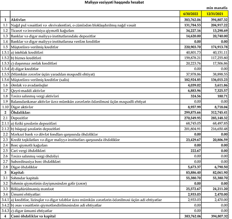 Qeyd olunan dövr üçün bankın aktivləri 383.8 mln. manat, kredit portfeli ise 220.9 mln manat olmuşdur. Ötən ilin sonu ilə müqayisədə müştərilərə verilən kreditlərin ümumi həcmində 26% olmaqla, biznes kreditlərinin 36% artımı müşahidə edilib. Belə ki, korporativ müştərilərə verilən kredit portfelinin həcmi ötən ilin eyni dövrü ilə müqayisədə artaraq 2022-ci ilin ikinci rübündə 160 milyon manata çatmışdır və xüsusilə qeyd etmək lazımdır ki, həmin portfelin iqtisadi sahələr üzrə strukturunda qeyri-neft sektoru üstünlük təşkil edir.