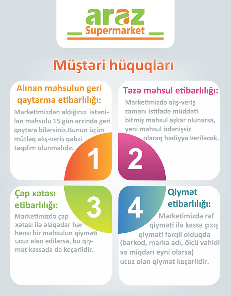 -Müştəri xidmətləri üzrə nümayəndələrimiz müraciətləri araşdırır və çevik həlli üçün çalışır. Sosial şəbəkələr vasitəsilə izləyiciləri istehlakçı hüquqları barədə məlumatlandırırıq. İnsan amili olan yerdə təbiidir ki, müəyyən nöqsanlar da yarana bilər və biz müştərilərimizi narahat edən istənilən məsələyə görə məsuliyyətimizi dərk edirik. “Araz” supermarketlər şəbəkəsi olaraq, alıcılarımızın əsas ehtiyacı olan məhsulları onlara mümkün olan yaxşı keyfiyyət və mümkün aşağı qiymətlərlə təqdim etməyə çalışırıq. Əsas hədəfimiz ədalətli ticarət və müştərilərimizin məmnuniyyətidir.