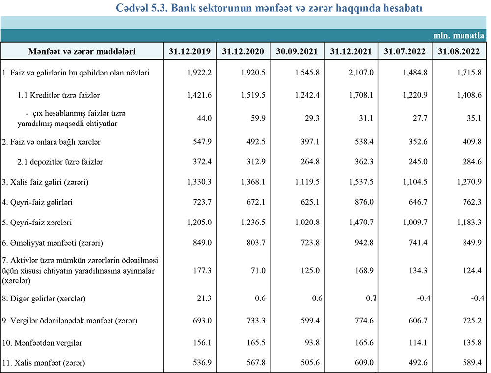 31 avqust 2022-ci il tarixinə olan bank sektorunun əsas göstəriciləri açıqlanıb.