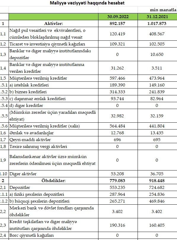 Əsasən hüquqi şəxslərin hesablarındakı vəsaitlərinin azalması ilə əlaqədar olaraq "Rabitəbank"ın depozit portfeli 171 milyon 447 min manat və ya 23,6% azalaraq 553 milyon 235 min manata geriləyib. Bu azalma aktivlərin də düşməsinə təsir edib. Əsasən nağd pul vəsaitlərinin azalması ilə əlaqədar olaraq cəmi aktivlər 125 milyon 716 min manat və ya 14,1% azalaraq azalaraq 30 Sentyabr 2022-ci il tarixində 892 milyon 157 min manat təşkil edib. Ötən ilin sonunda Bankın cəmi aktivləri 1 milyard manat səviyyəsini keçmişdi.