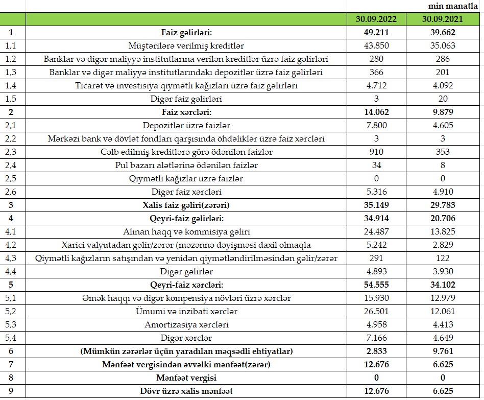 Müqayisə üçün qeyd edək ki, 2021-ci ilin 9 ayı ərzində "Rabiətbank"ın cəmi əməliyyat gəlirləri 60 milyon 368 min manat, cəmi əməliyyat xərcləri 43 milyon 981 min manat, əməliyyat mənfəəti 16 milyon 387 min manat təşkil etmişdi. Bank əməliyyat mənfəətindən 9 milyon 761 min manat mümkün zərərlər üçün yaradılan məqsədli ehtiyatlara ayırmışdı.