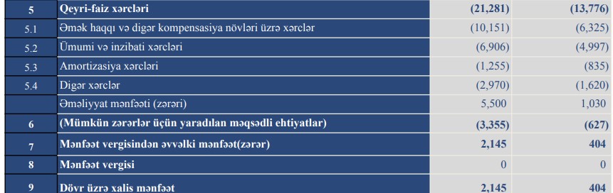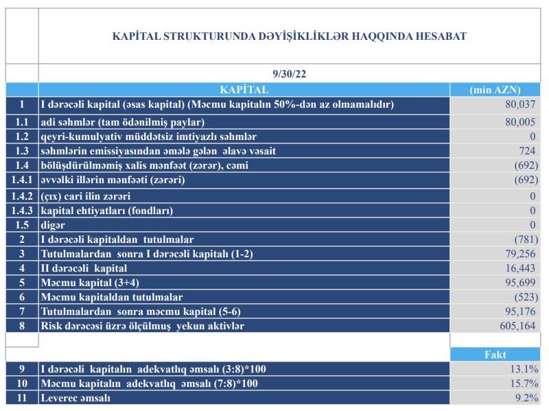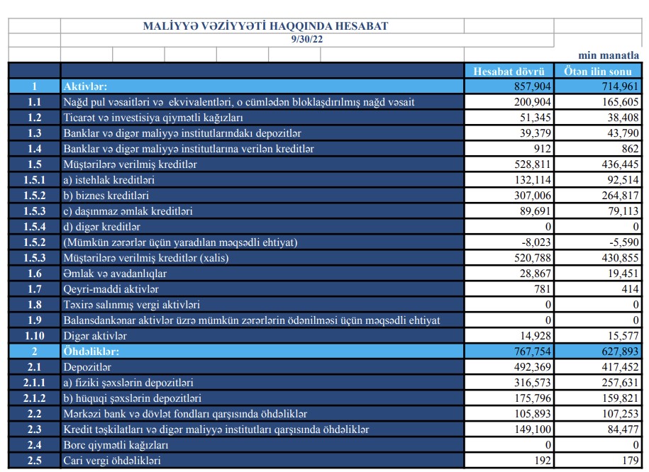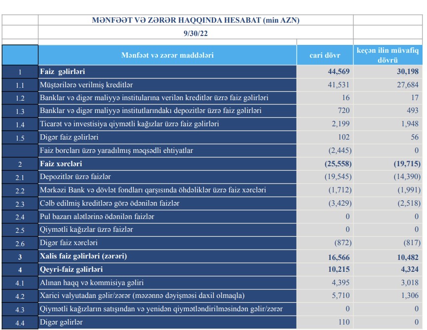 Bank 2022-ci ilin 9 ayını 2,1 milyon manat mənfəətlə başa vurub