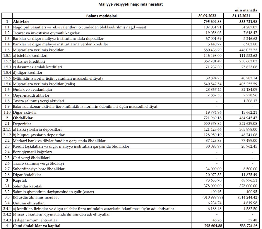 "Yelo Bank"ın depozit portfeli 2022-ci ilin 9 ayında ötən ilin sonu ilə müqayisədə 197 milyon 739 min manat və ya 56% artaraq 550 milyon 378 min manata çatıb.