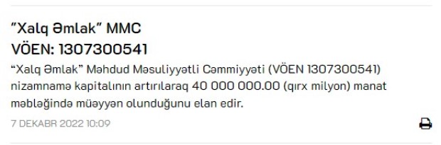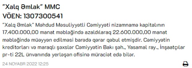 Maraqlı burasındadır ki, 24 noyabr 2022-ci il tarixində, "Xalq Əmlak" MMC-nin nizamnamə kapitalının 17,4 milyon manat azaldılaraq 40 milyon manatdan 22,6 milyon manata endirilməsi barədə qərar elan edilmişdi. ""Xalq Əmlak" Məhdud Məsuliyyətli Cəmiyyəti nizamnamə kapitalının 17.400.000 manat məbləğində azaldılaraq 22.600.000 manat məbləğində müəyyən edilməsi barədə qərar qəbul etmişdir",- MMC-nin elanında bildirilirdi.