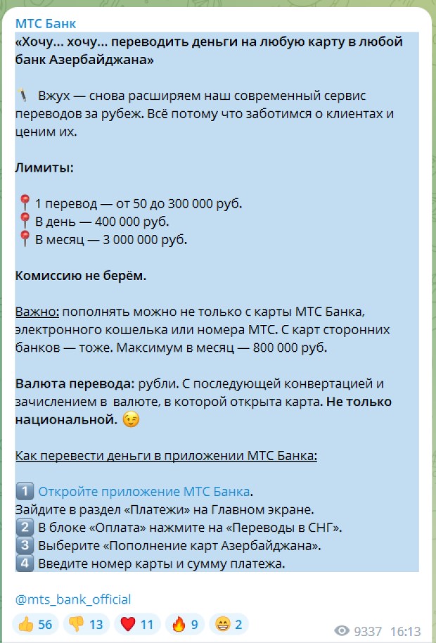 “Köçürmələr rublla həyata keçirilir. “MTS Bank” köçürmələrə görə komissiya tutmur. Birdəfəlik köçürmənin minimum məbləği 50 rubl, maksimum məbləği 300 min rubldur”, - deyə məlumatda qeyd olunur.