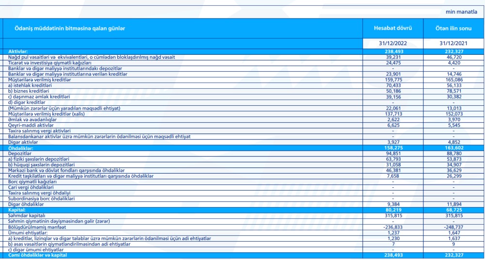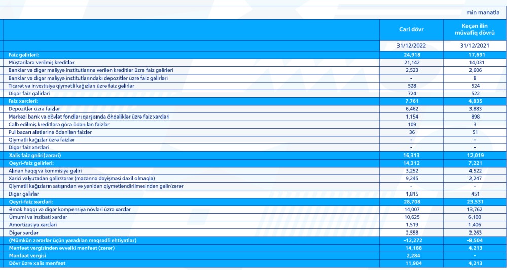 Bank hesabat dövrünü 11.9 milyon manat xalis mənfəətlə bitirib ki, bu da 2021-ci ilin sonuna olan göstəricidən 2.8 dəfə çoxdur.