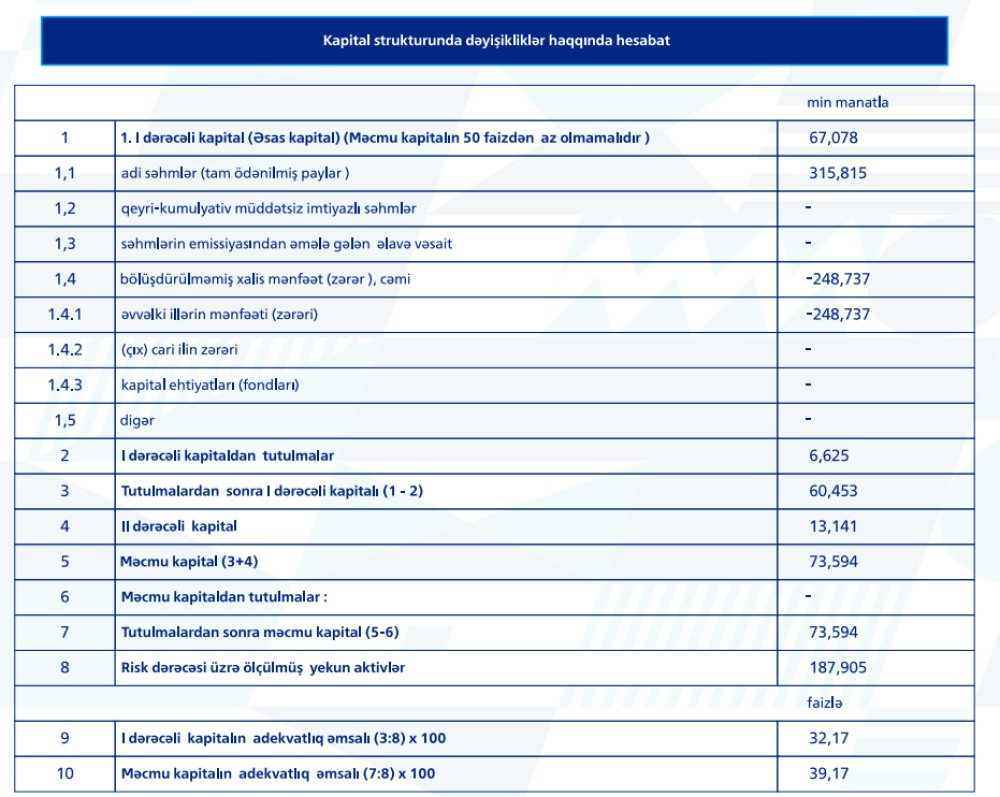 Bankın məcmu kapitalı 2022-ci ildə 16.7% artaraq 80.2 milyon manata çatıb, bu da Mərkəzi Bankın minimal tələblərindən 60.4% çoxdur.