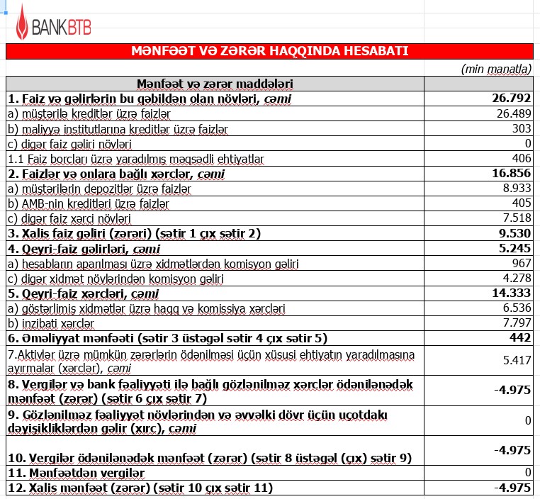 "Bank BTB" ASC ötən il aktivlər üzrə mümkün zərərlərin ödənilməsi üçün xüsusi ehtiyatın yaradılmasına 5 milyon 417 min manat ayırıb, bununla əlaqədar olaraq Bank ili 4 milyon 975 min manat xalis zərər ilə bağlayıb. Ehtiyat bankın gələcəkdə risklərə qarşı daha dayanıqlı olması və fəaliyyətinin fasiləsizliyini təmin etmək üçün yaradılır.