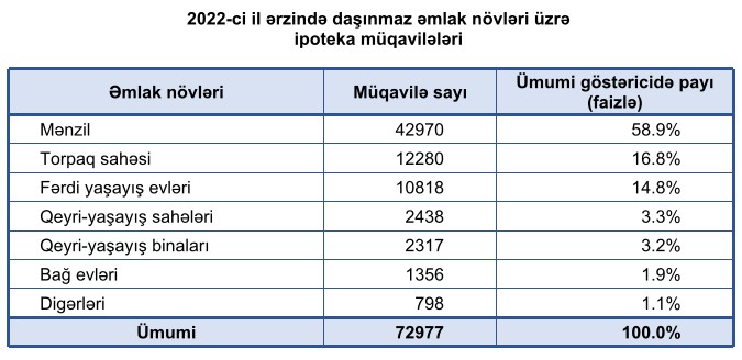 2022-ci il ərzində Azərbaycanda girov qoyulan əmlaklar sırasında mənzillər, torpaq sahələri və fərdi yaşayış evləri ilk 3-lükdədir. Ən çox girov qoyulan daşınmaz əmlak isə mənzillərdir. Belə ki, 2022-ci ildə 42.970 mənzil üzrə ipoteka müqaviləsi bağlanılıb. Ötən ildə girov qoyulmuş ümumi 72.977 əmlakdan 12.280-i torpaq sahəsinin, 10.818-i isə fərdi yaşayış evinin payına düşüb.