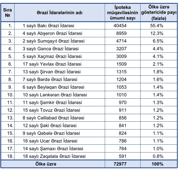 Daşınmaz əmlak üzrə ən çox ipoteka müqaviləsi paytaxt Bakıda bağlanıb. Ötən il ərzində paytaxtda ümumilikdə 40.454 ipoteka müqaviləsi bağlanılıb ki, bu da ölkə üzrə ümumi göstəricinin 55,4%-ni təşkil edir. Bakıdan sonra ən çox ipotekanın dövlət qeydiyyatı Əmlak Məsələləri Dövlət Xidmətinin “Daşınmaz Əmlakın Dövlət Kadastrı və Reyestri” publik hüquqi şəxsin 4 saylı Abşeron (8959 müqavilə), 2 saylı Sumqayıt (4714 müqavilə), 3 saylı Gəncə (3207 müqavilə) və 5 saylı Xaçmaz ərazi idarələrində (3009 müqavilə) aparılıb. Həmçinin, 17 saylı Yevlax və 13 saylı Şirvan ərazi idarələri də daşınmaz əmlakın ən çox girov qoyulduğu bölgələr sırasındadır. Bunu, həm də bölgədəki iqtisadi aktivliyin göstəricilərindən biri kimi qiymətləndirmək olar.