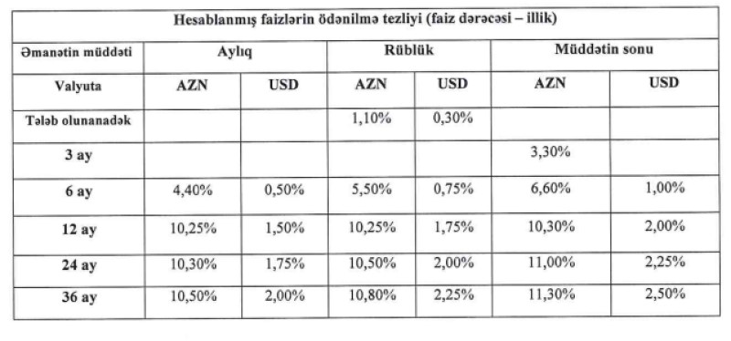 12 ay müddətinə yerləşdirilən, faizin aylıq ödənişi üzrə əmanət məhsulunun faizi 9,25%-dən 10,25%-ə yüksəlib. Faizin müddətin sonunda ödənişi şərti üzrə isə əmanət faizi 10%-dən10,3%-ə qaldırılıb.